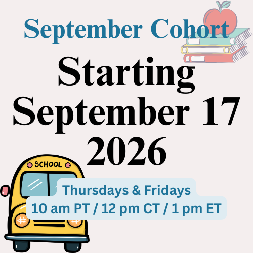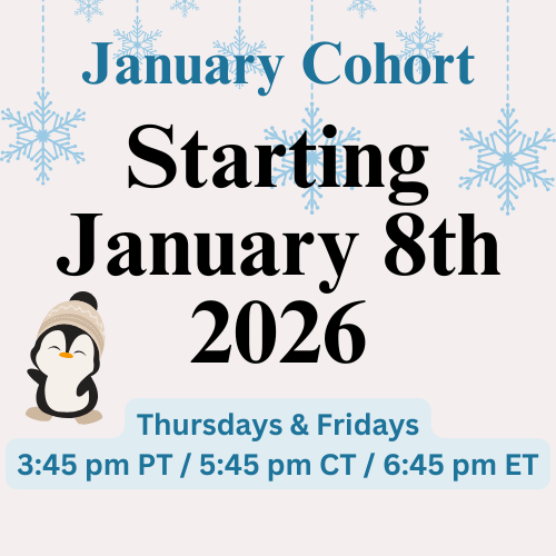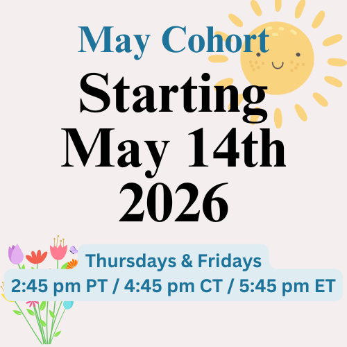 Your cohort lessons are cumulative (content builds) and will be on Thursdays and Fridays every week. (See cohort options above for schedule).Â